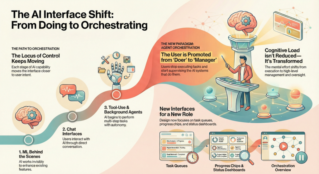 The core design shift is stated plainly across the field: the locus of control keeps moving. Early ML features needed micro-copy. Chat demanded conversation design. Agents now need orchestration UI. The progression is presented as a natural evolution. The implication is that orchestration UI is simply the next design challenge — harder, yes, but fundamentally continuous with what came before.